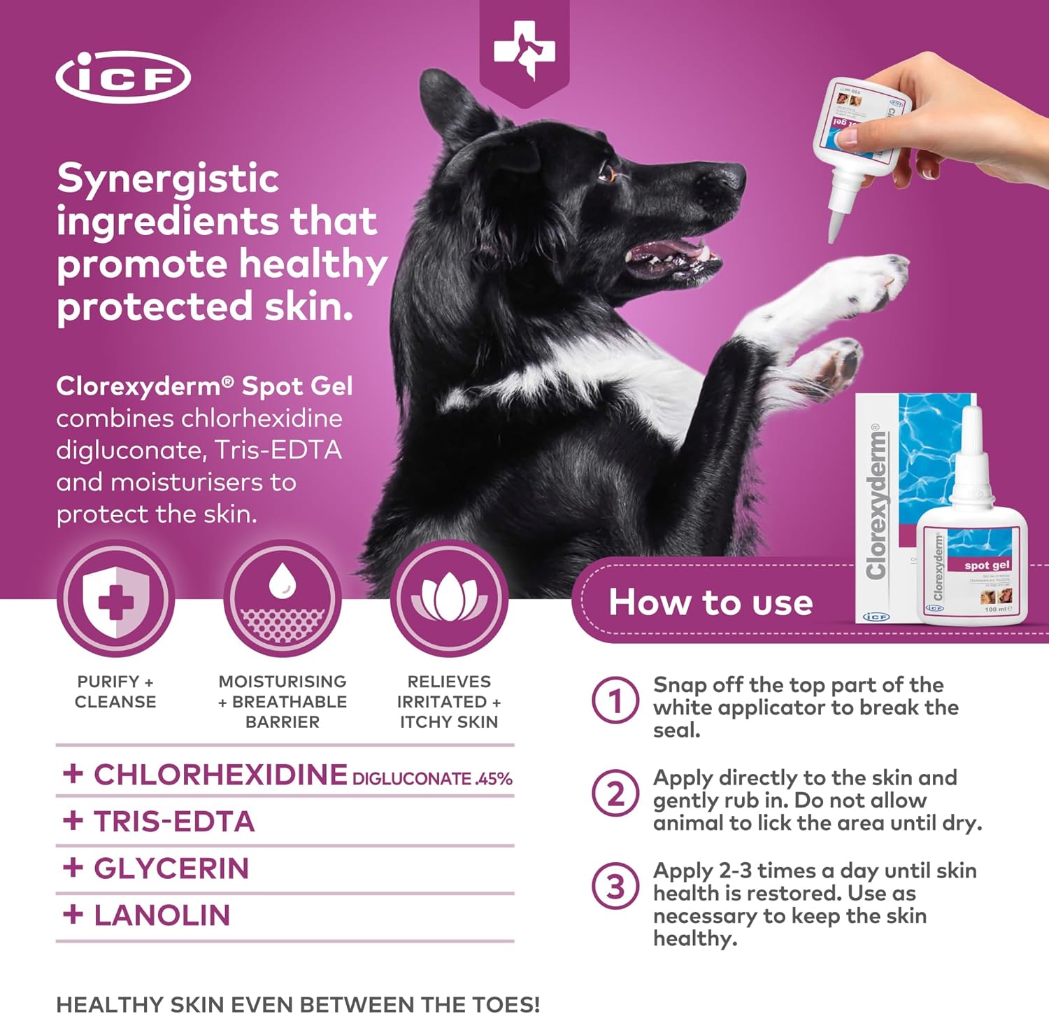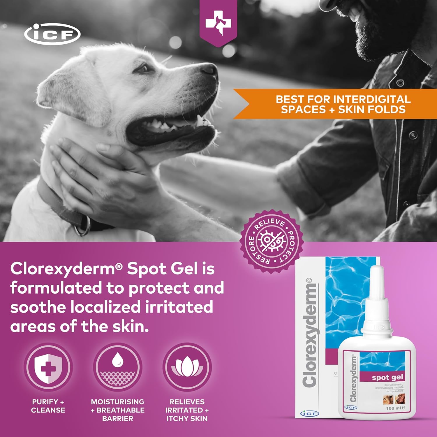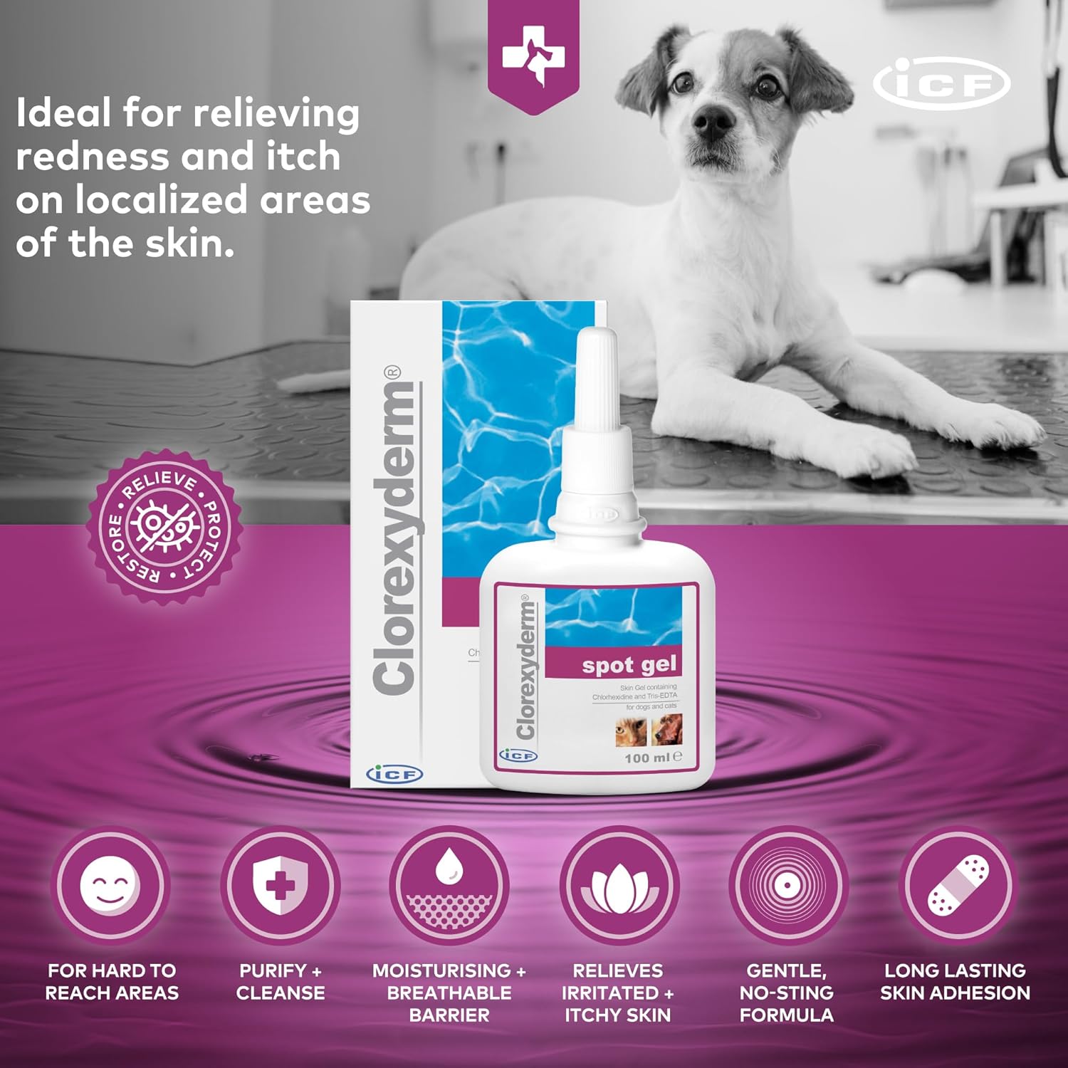 Meet the ICF Clorexyderm Gel: A smart, skin-soothing formula for pets with itchy, irritated spots in all the tricky places.