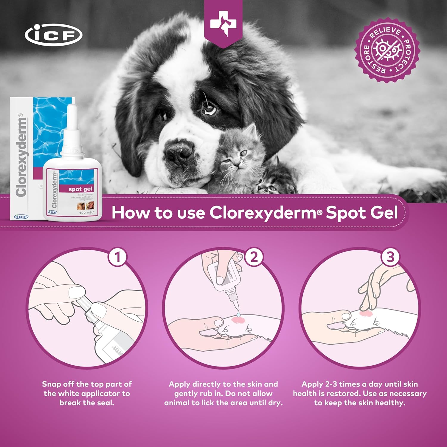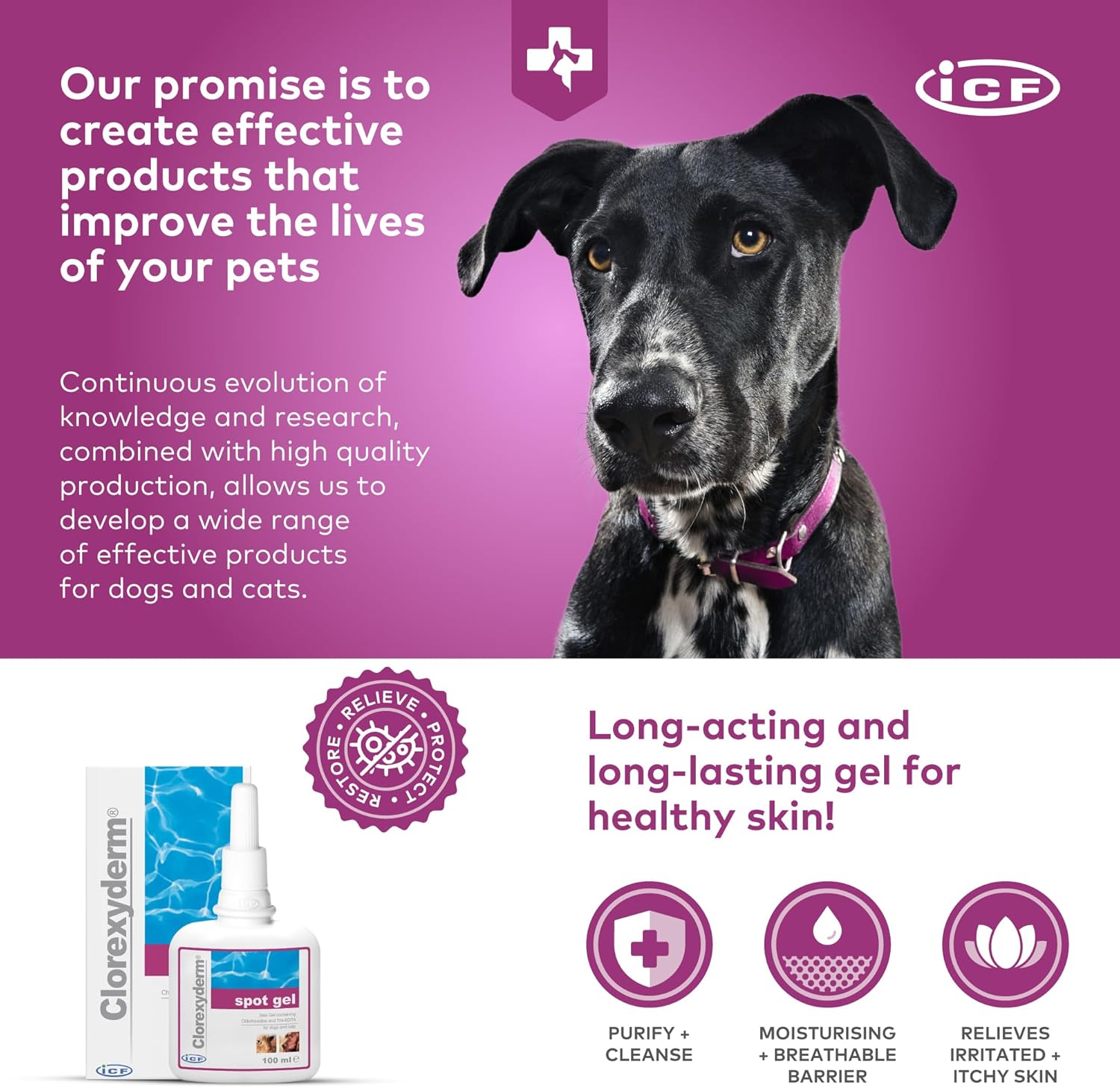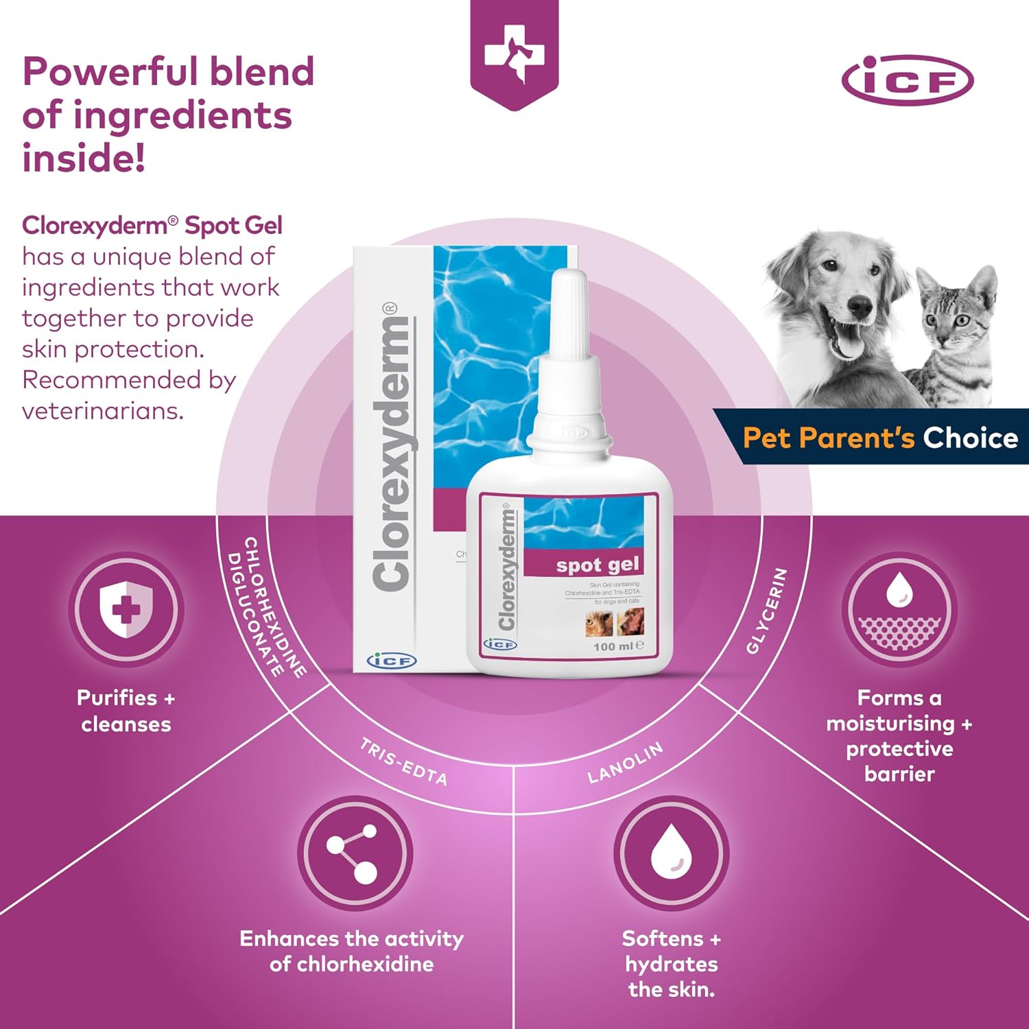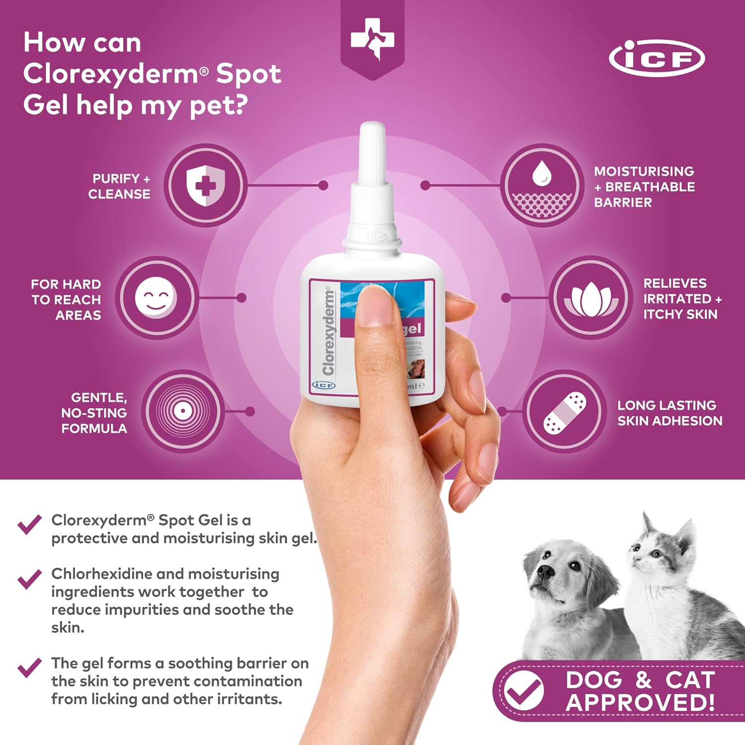 Meet the ICF Clorexyderm Gel: A smart, skin-soothing formula for pets with itchy, irritated spots in all the tricky places.