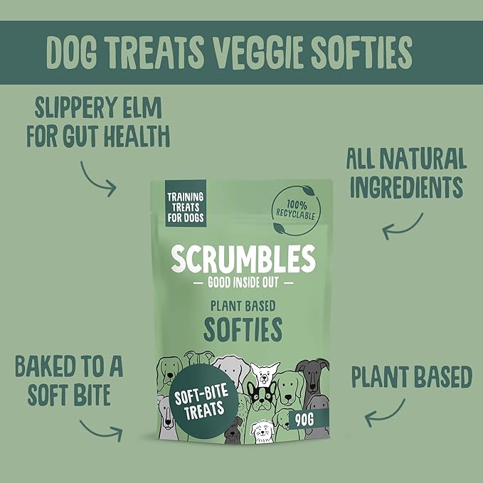Meet Scrumbles Softies: Plant-powered training treats crafted for pups with delicate digestion and picky palates.