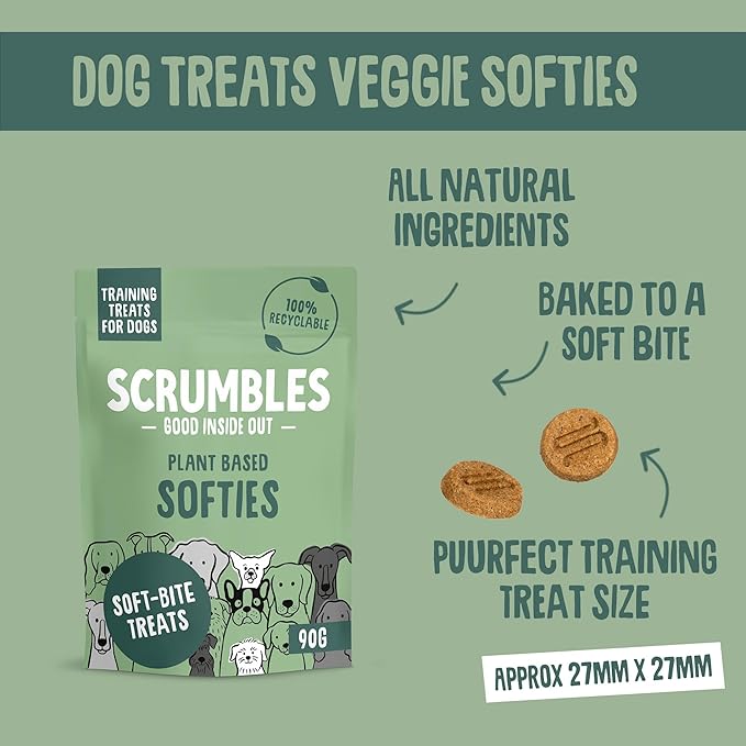 Scrumbles Softies Plant-Based Dog Training Treats (90g) Grain-Free, Low-Fat, Hypoallergenic Bites for All Ages Eco-Friendly, Gentle on Tummies (Veggie)